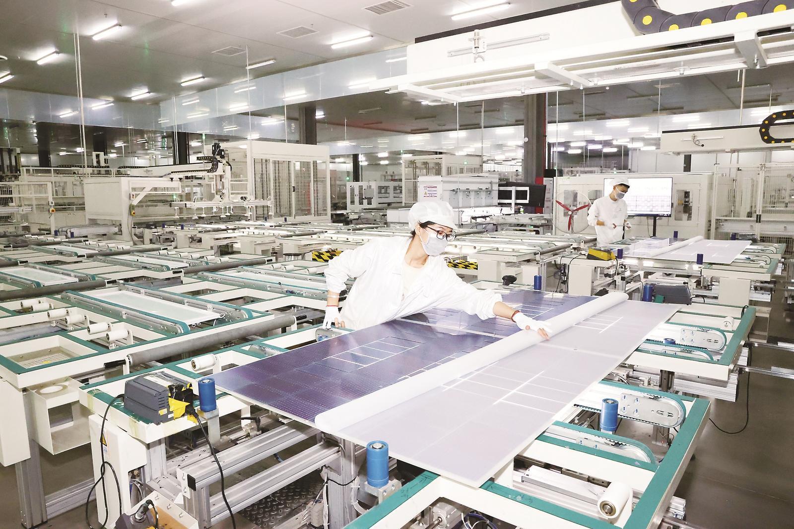 正泰松原新能源基地由松原市新能光伏科技有限公司负责实施,运用大数据、云计算和人工智能等先进技术,建成高效太阳能组件生产线。图为公司生产车间。 丁研 摄