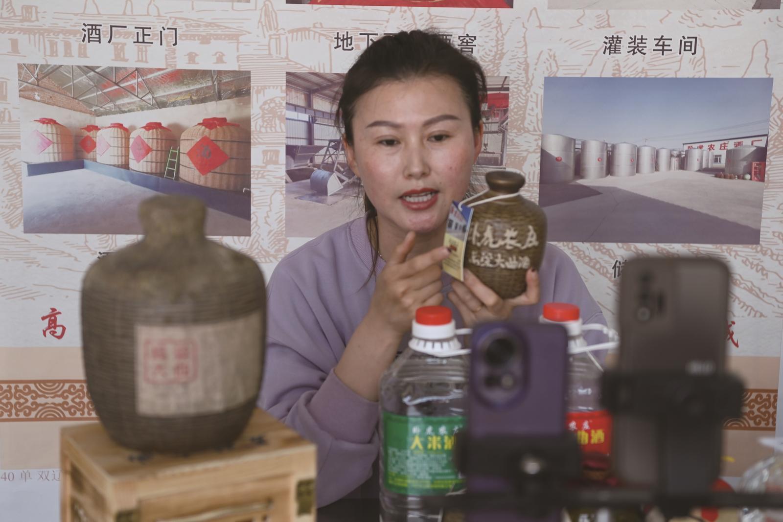 双辽市五星村卧虎农庄酒业的员工正在进行直播。
