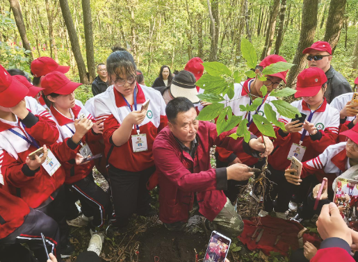 在云岭野山参保护区,“参把头”带领研学游学生采挖人参。企业供图
