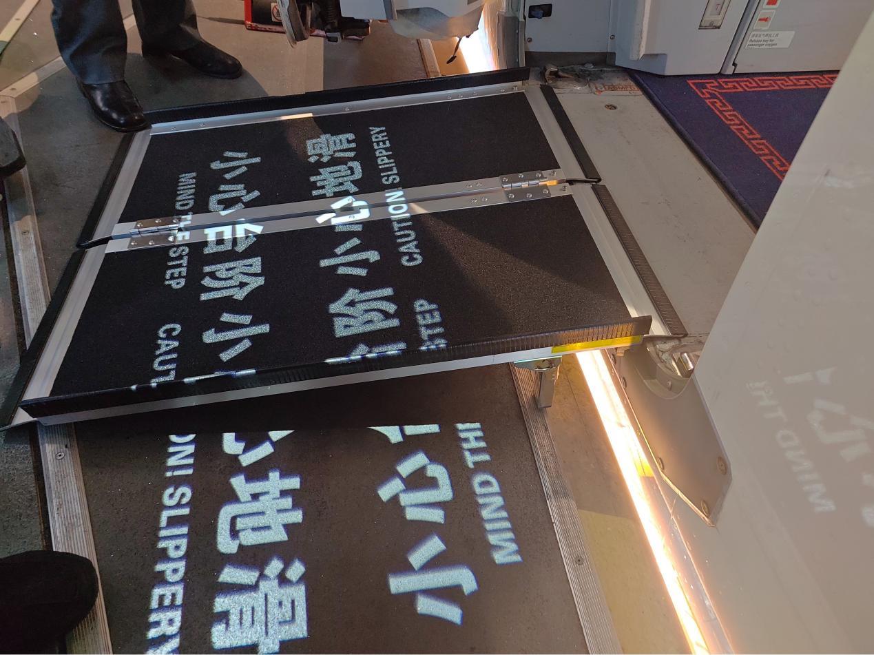 此次升级的无障碍坡道,是在现有轮椅坡度过渡板基础上,结合机场登机桥、平台车保障实际及旅客出行需求进行的创新优化。在结构设计上,采用轻量化金属骨架与可快速展开的铰链模块,兼顾便携性与强度稳定性,一线保障人员能快速部署到位,大幅提升现场响应效率;坡道配备加宽载物面板与低坡度过渡结构,两侧增设边缘防护板,确保轮椅旅客平稳通行;同时在与飞机舱门接触区域加装防撞保护胶条,有效避免设备与飞行器金属结构碰撞,全方位提升使用安全性。