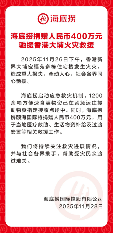 另外,海底捞宣布,将携颐海国际捐赠人民币400万元(约为439.7万港元),用于当地医疗救助、生活物资补给及过渡安置等相关救援工作。海底捞表示,将持续关注救灾进展情况,并与社会各界携手,帮助受灾民众渡过难关。