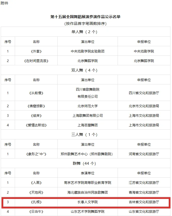 近日,文化和旅游部公示第十五届全国舞蹈展演参演作品名单,由吉林省文化和旅游厅推荐,长春人文学院音乐舞蹈学院舞蹈系原创的东北秧歌作品《扎根》成功入选。展演将于2025年12月在江苏无锡举行。
