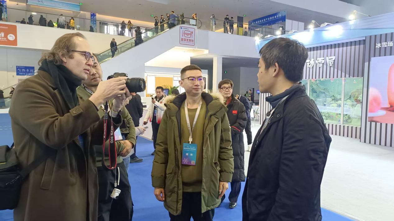 步入展区,采风团成员们对冰雪产业技术创新以及市场情况表现出浓厚兴趣。在冰雪设备展区,采风团的摄像师们将镜头对准了铭星冰雪的飘雪机,认真询问其具体功能及应用场景。供职于《土耳其光明报》的BALCI ONURCAN则在长春九台文旅展台前驻足良久,了解庙香山滑雪场的基础设施,并感受温泉水的独特功效。
