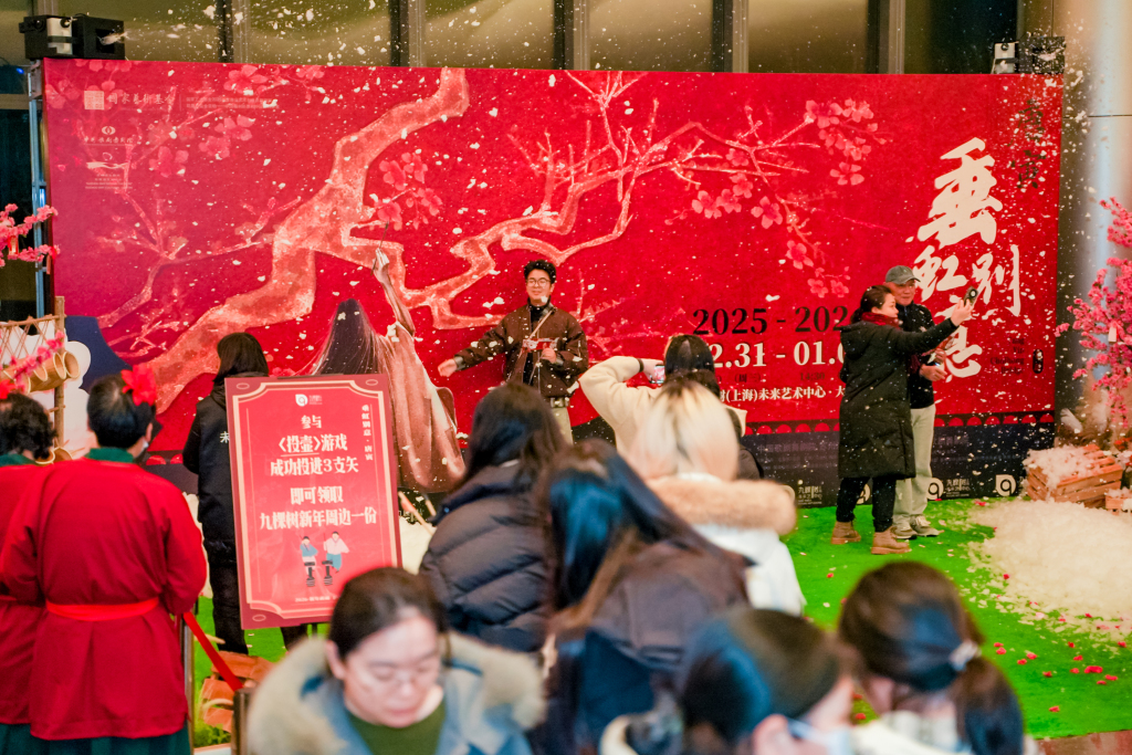 最热闹的当数互动区。有人浅酌一口特调的桃花酿,有人在投壶的游戏中赢得文创礼品,更有身着古装的“红娘”穿梭人群,以桃花为引邀请观众抽取缘分签……沉浸式游园让现场观众乐不思蜀。