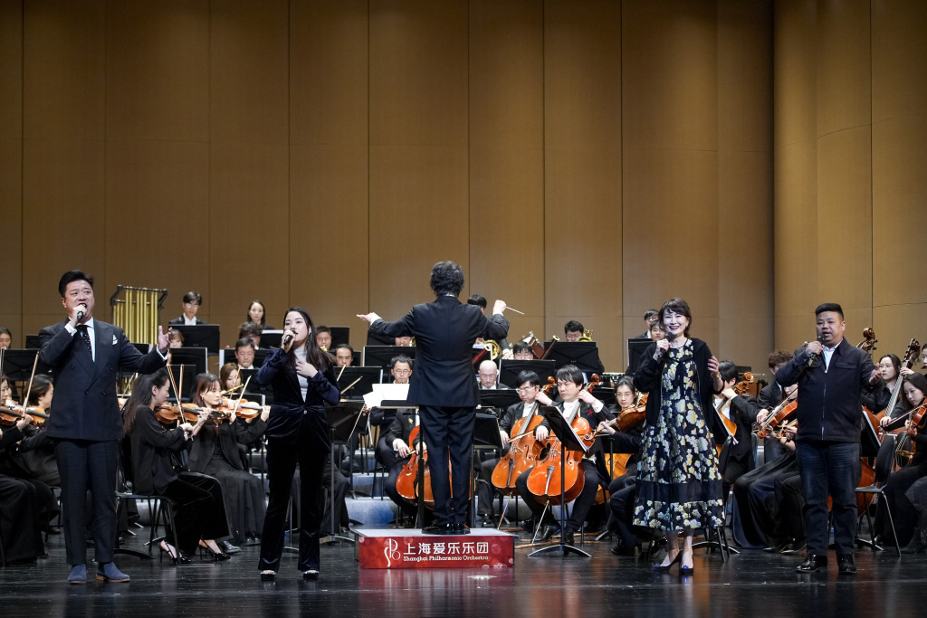 返场,乐团奏响《茉莉花》。陈燕华和男高音李再耀登场,并邀临港创业代表苗彩华和上海飞机制造有限公司员工罗健,联袂演唱《年轻的朋友来相会》。