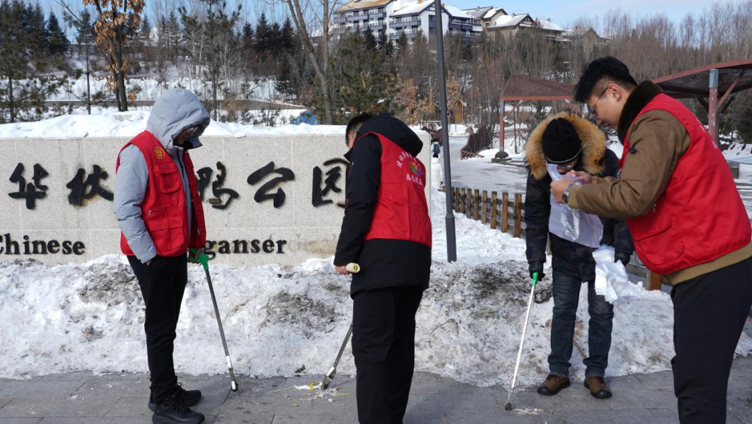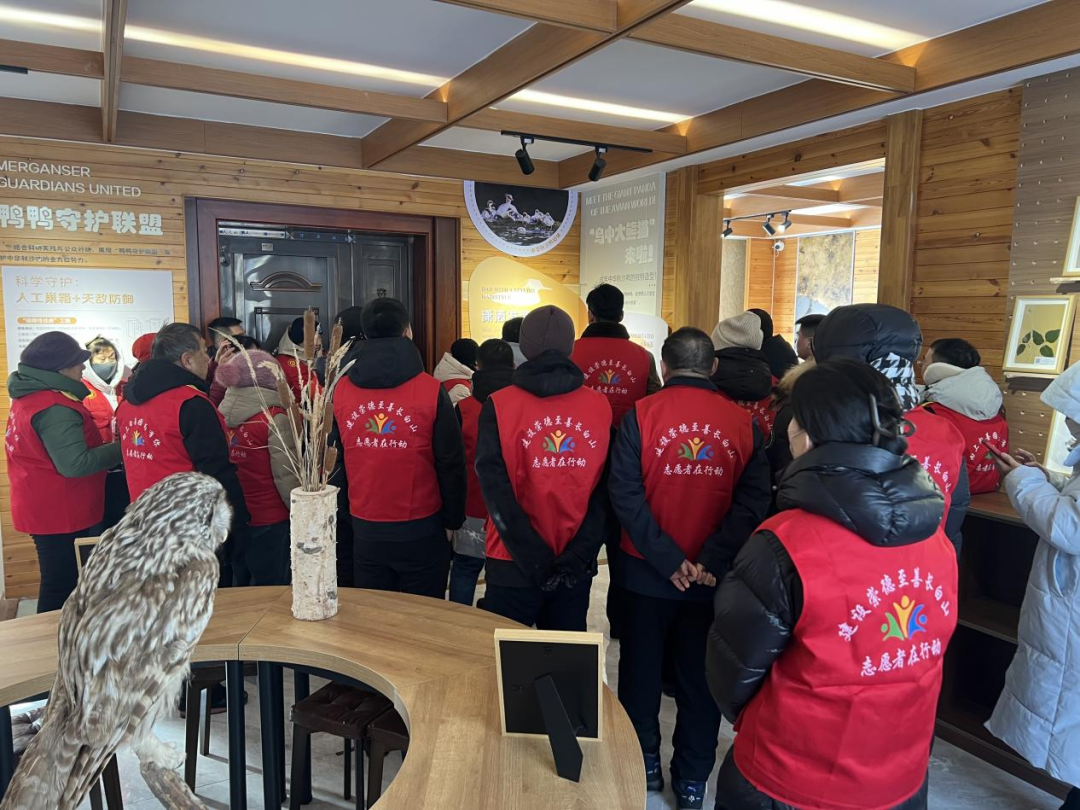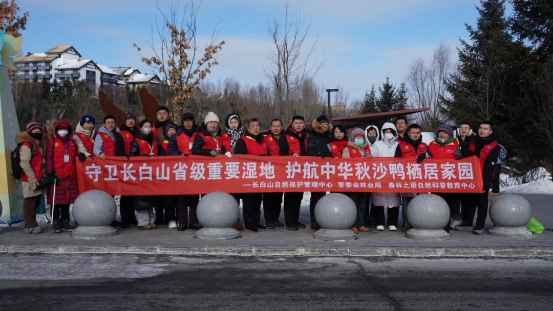 活动期间,由长白山管委会林业局、长白山森林之语自然科普教育中心及社会各界人士组成的志愿者团队,首先来到头道白河2号地鸭鸭驿站。在长白山科学院专家的现场讲解下,志愿者们系统了解了湿地在涵养水源、调节气候、维护生物多样性等方面的重要生态功能。随后,志愿者队伍前往中华秋沙鸭公园及沿河区域开展环境卫生清理行动,重点捡拾河道垃圾,以实际行动维护湿地生态健康。同时,志愿者们向沿途游客与居民发放湿地保护及珍稀水禽科普宣传册,积极倡导“珍爱湿地、保护水禽、共建生态家园”的绿色风尚。