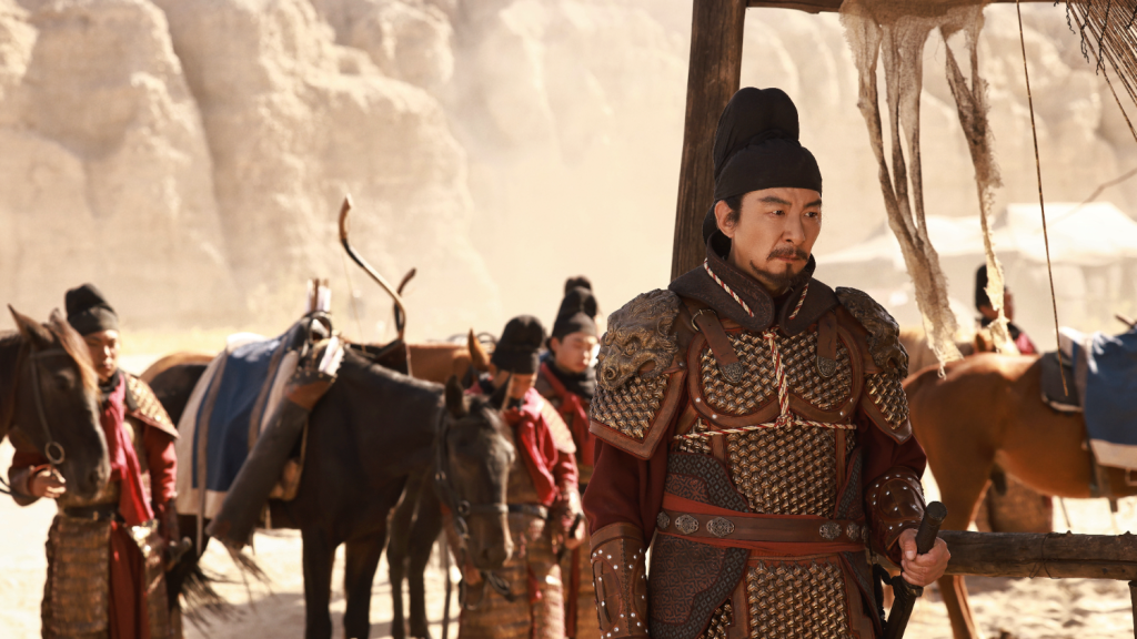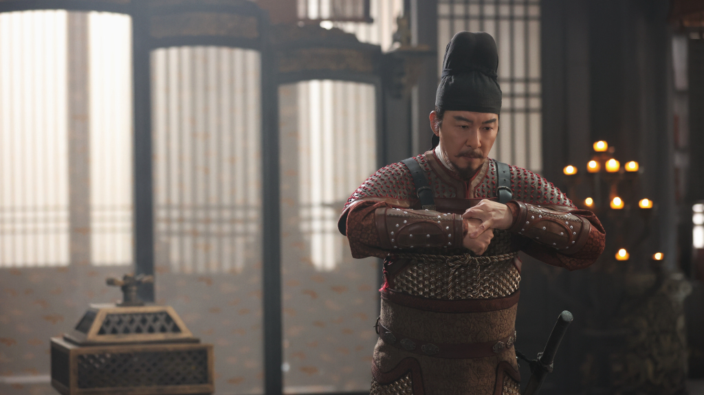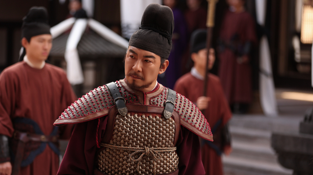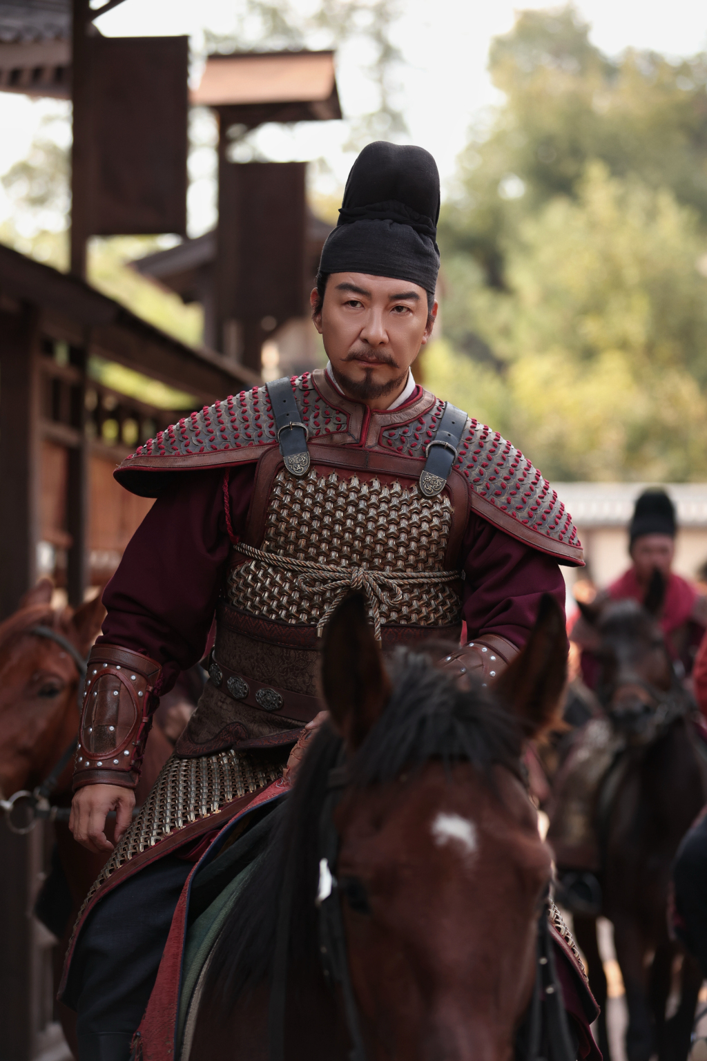 郝平:赵弘殷在历史上记载不多,但他是一个禁军统领,而且是伺候过五代帝王的这么一个人物。我查了史书,他的马上功夫非常了得。所以最后呈现出一个武将的形象,形体、声音、台词上让他更加铿锵有力一些。而且他几乎很少坐着,除了站着就是跪着。服装老师也给了很大的帮助,我们穿的盔甲,下面垫了一层厚厚的那种棉服,是为了让他显得魁梧健壮。导演当时和我说,这个角色就一个字,燃烧的“燃”。