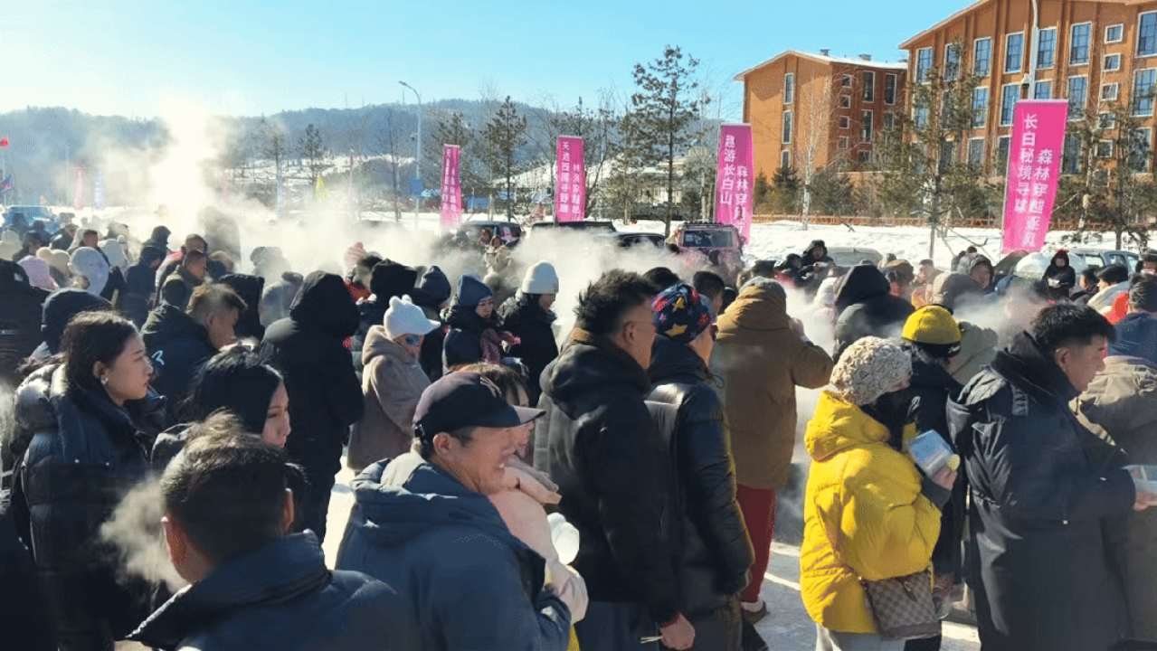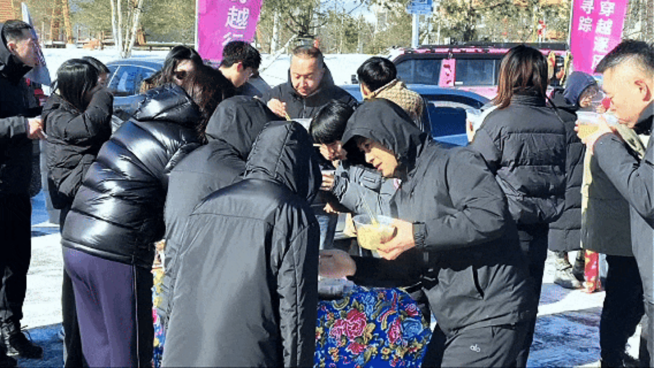 中午时分,长白山西景区游客中心停车场的空地上,几口大锅咕嘟咕嘟冒着热气,杀猪菜、铁锅炖、参鸡汤等各种特色东北美食的香气和诚意化作触手可及的温暖,驱散了寒意,也成为与各地越野爱好者最自然的交流方式。