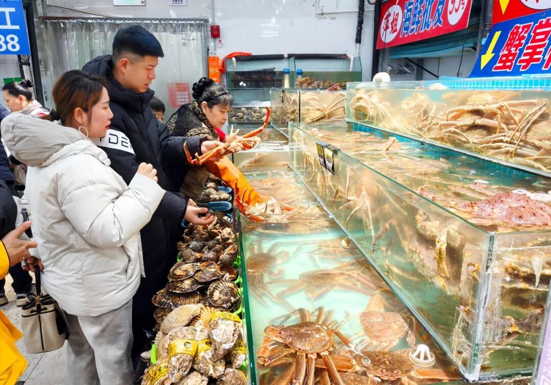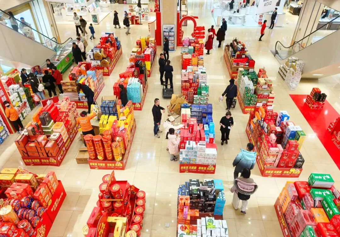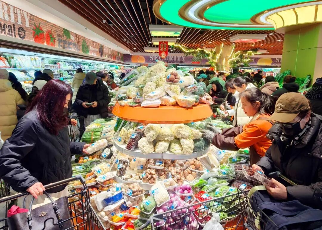最热闹的当属地下一层超市。蔬菜区、肉类区、熟食区、饮料酒水区,到处都是推车拎篮的市民。熟食区摊主瞿女士忙得满头是汗:“今天的销售量是平时的两倍!我们备货备得足足的,让大家都能买到心仪的商品。”