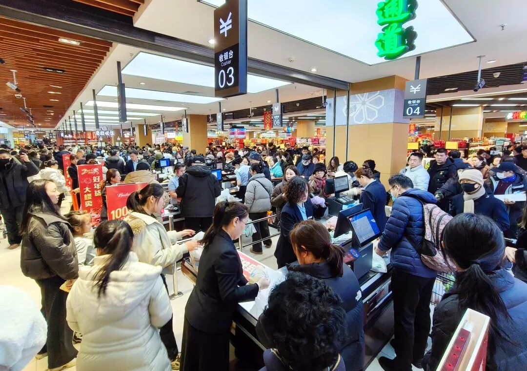 收银台前,长长的队伍蜿蜒延伸,几乎每个通道都排了十几个人。市民宋先生的购物车堆得满满当当:“今年一家八口一起过年,买这些做一大桌子菜,热热闹闹过个祥和年。”