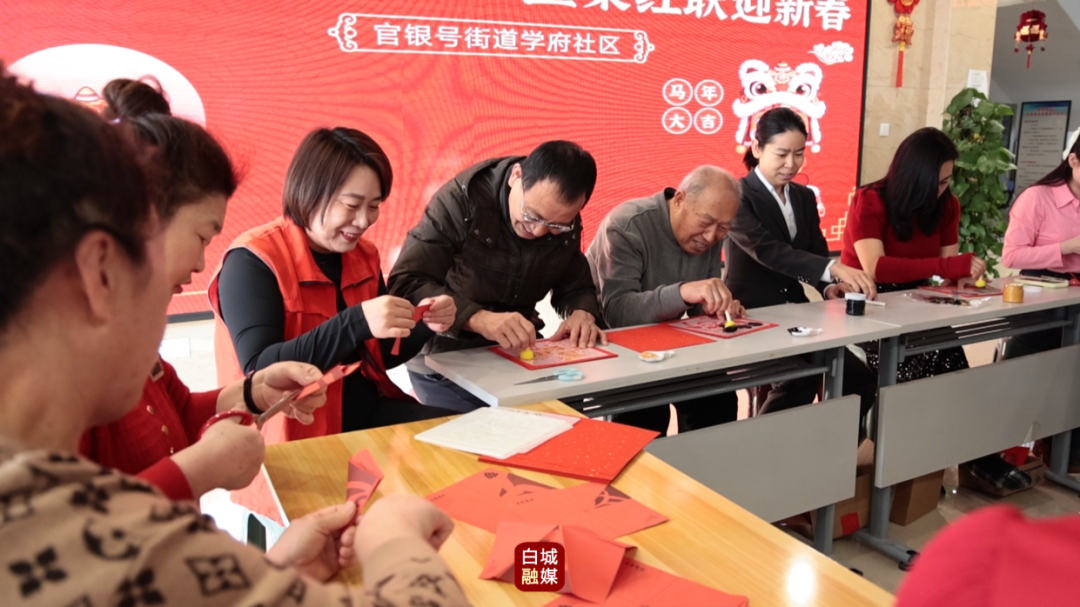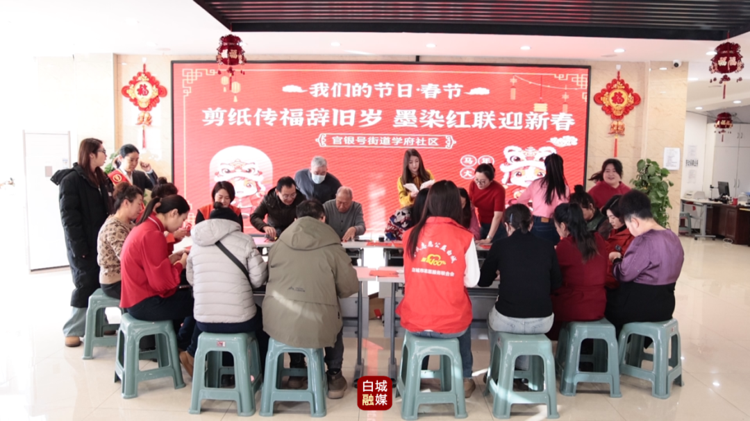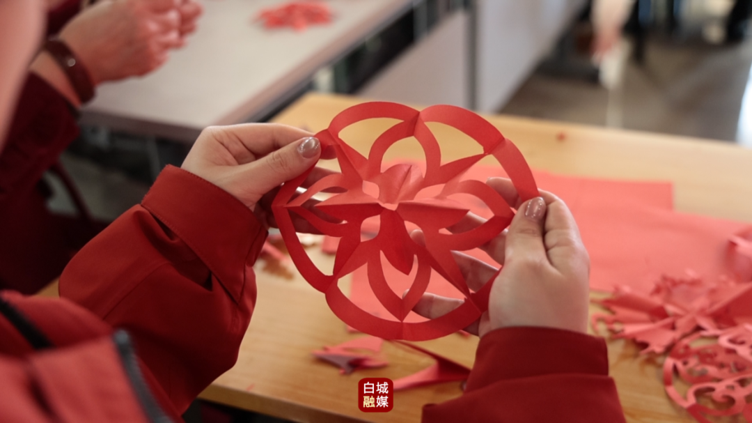 剪窗花不仅是为了让家里红红火火、好看喜庆,它背后藏着人们对美好生活的满满期盼和祝福。在学府社区,居民们在这样特殊的节日里围坐在一起做手工,借助红纸、剪刀、墨汁,一起迎接新年的福气和团圆。