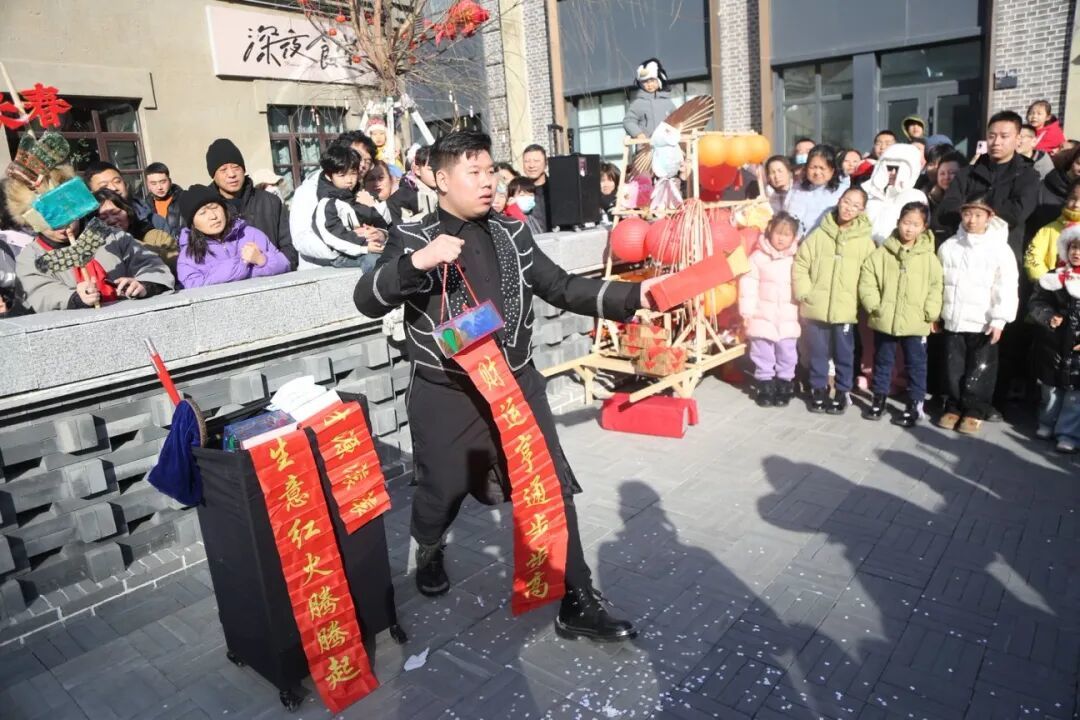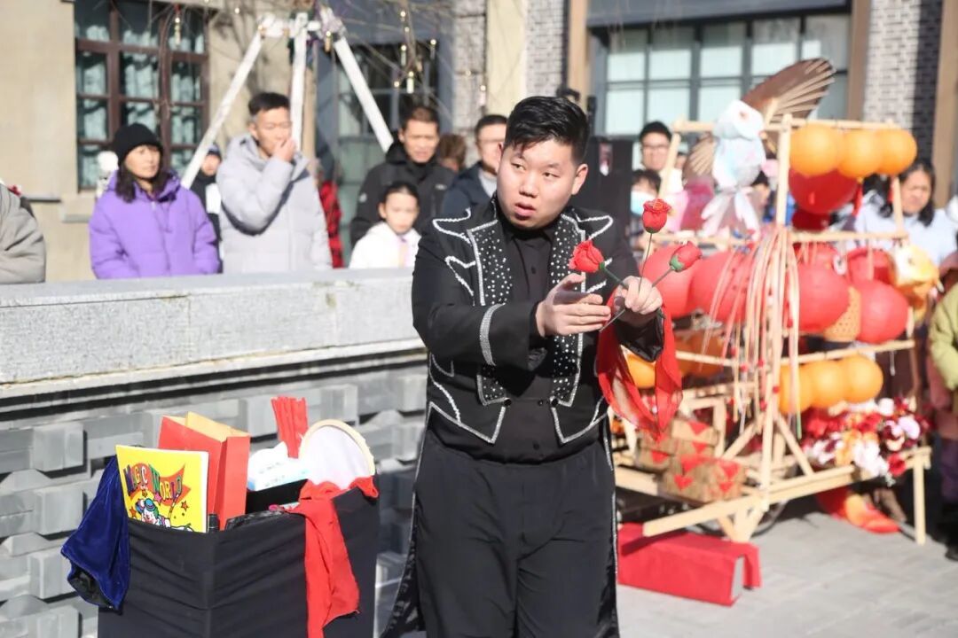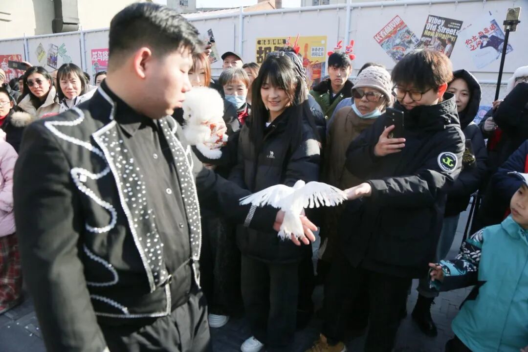 紧接着,一场精彩的魔术表演将现场气氛推向高潮。魔术师手法娴熟,就在观众眼皮底下大变活物——春联、鲜花、鸽子……一件件物品以不可思议的方式横空出世。