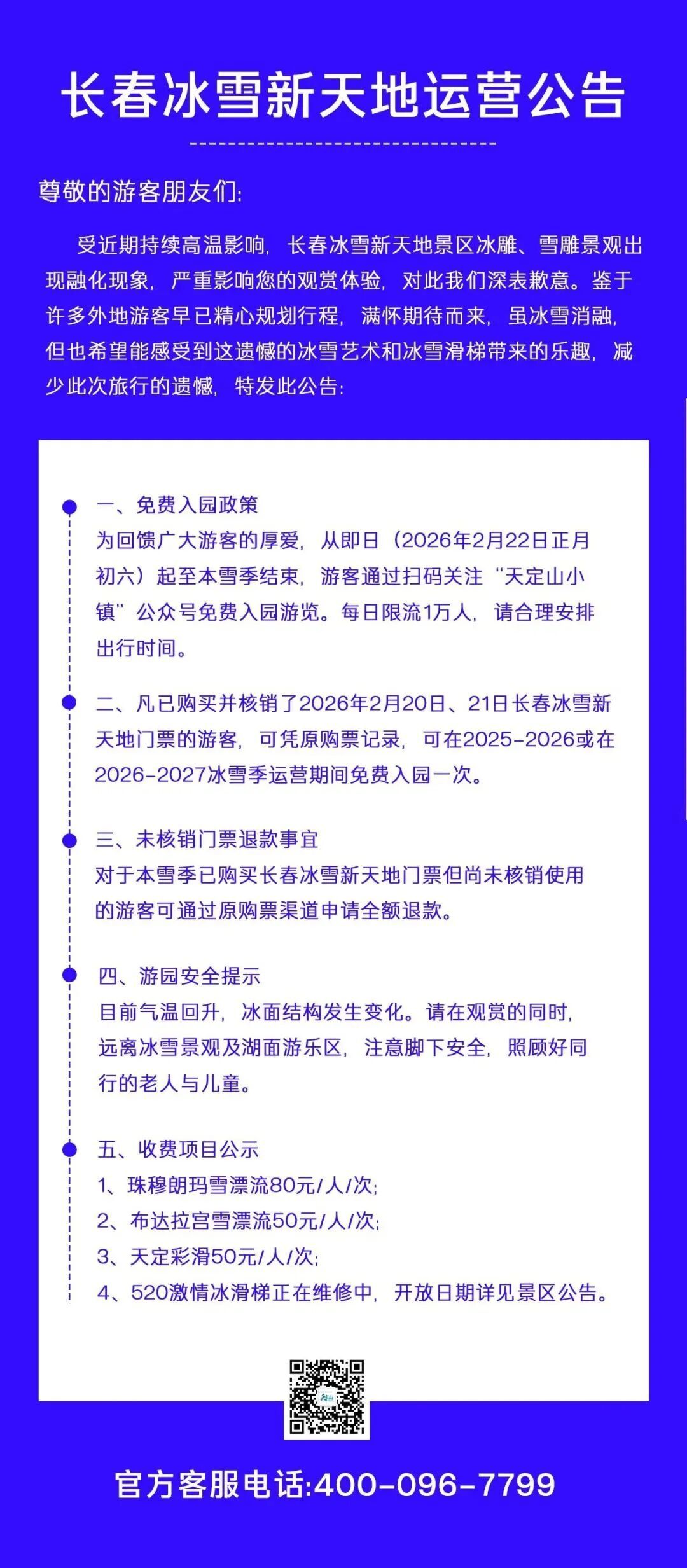 2月22日,农历正月初六,长春冰雪新天地公告:即日起至本雪季结束,游客搜索“天定山小镇”公众号即可免费入园,每日限流1万人。