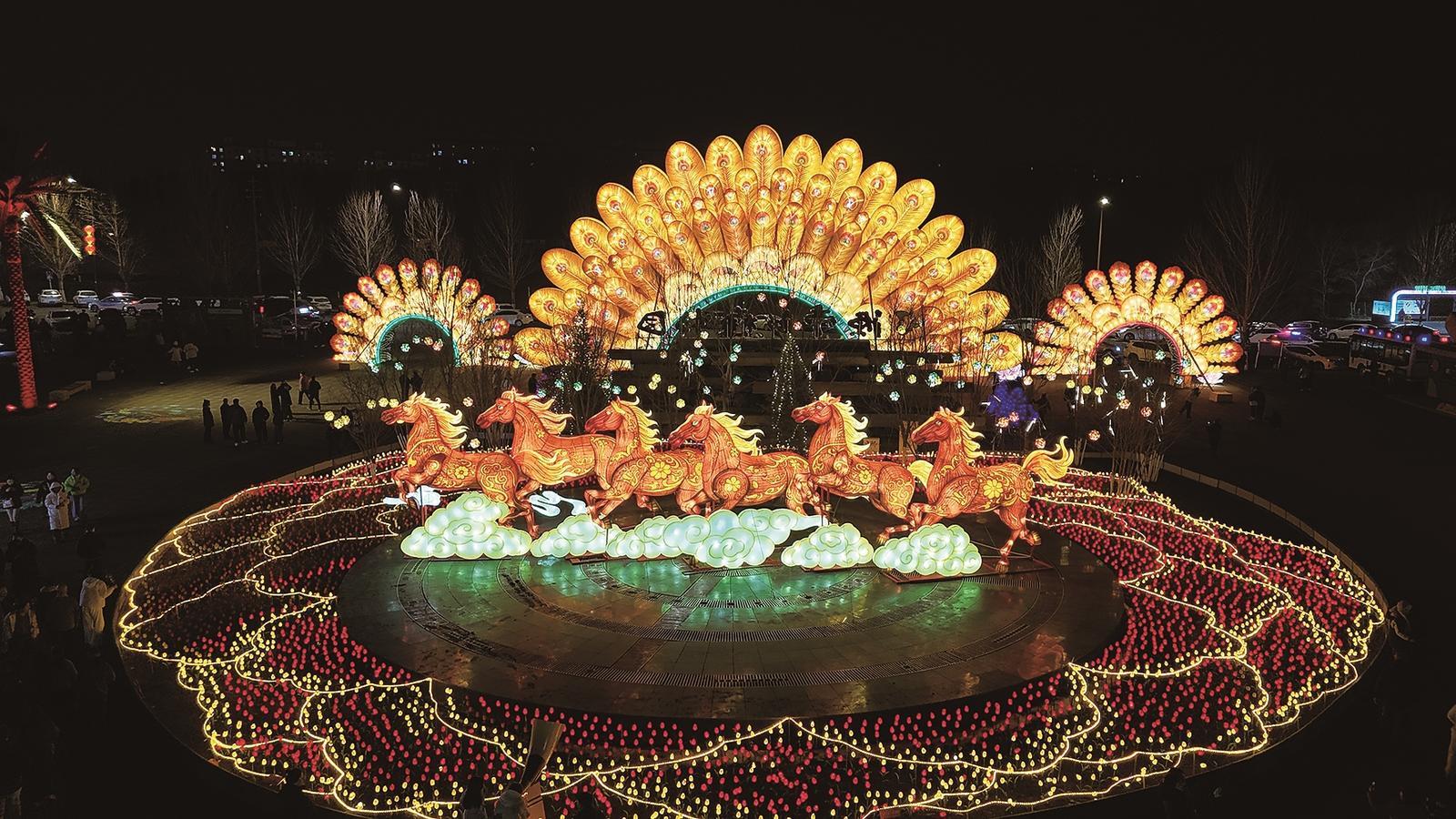 辽源市动植物园“马踏青云”主题灯组栩栩如生。