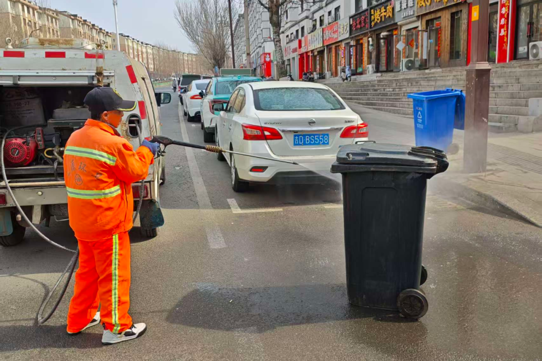 西安区同步发力,聚焦垃圾桶、果皮箱等“城市家具”开展集中清洗消杀。工作人员采用“浸润+铲除+高压冲刷”作业法,细致清理桶体油污污渍,逐个清洗消杀,从源头杜绝异味滋生,让环卫设施洁净如新。