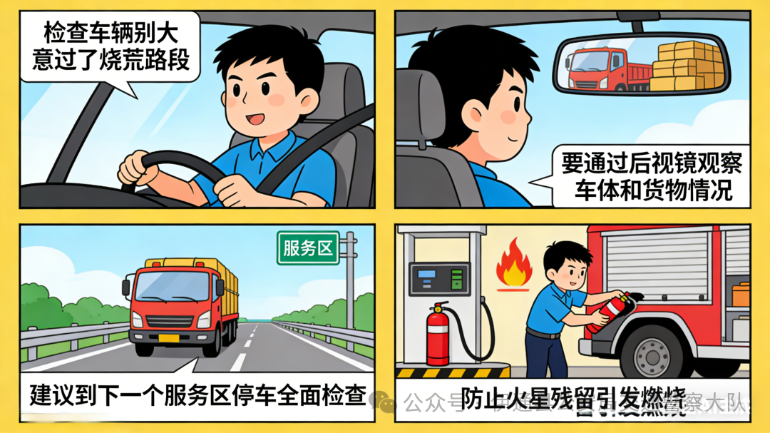 过了烧荒路段,要通过后视镜观察车体和货物情况,建议到下一个服务区停车全面检查,防止火星残留引发燃烧~