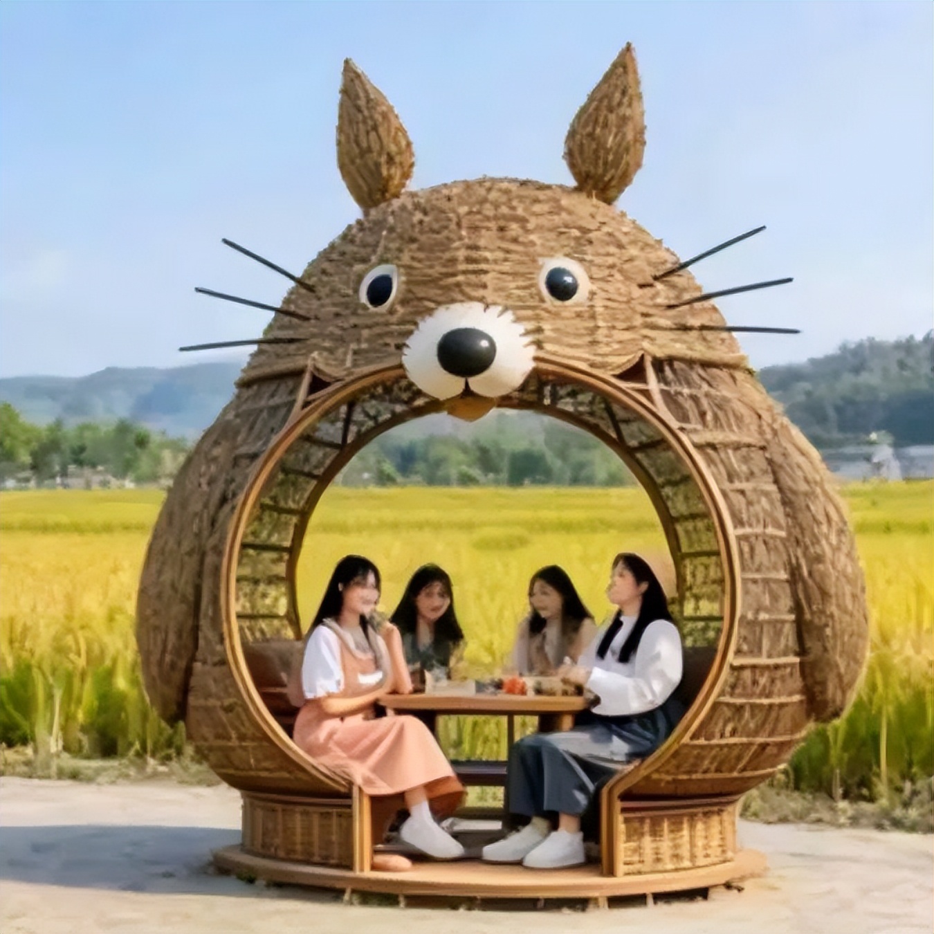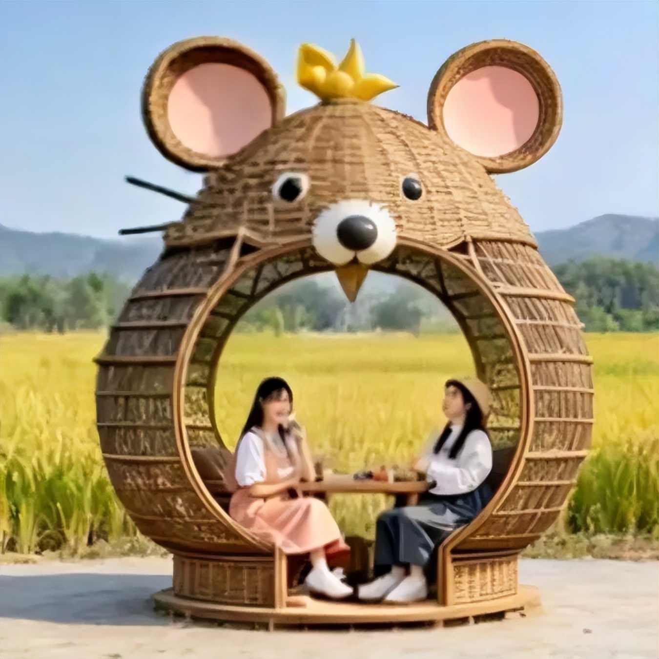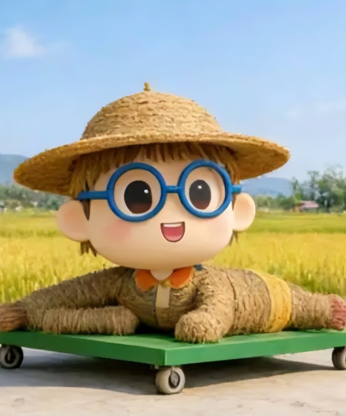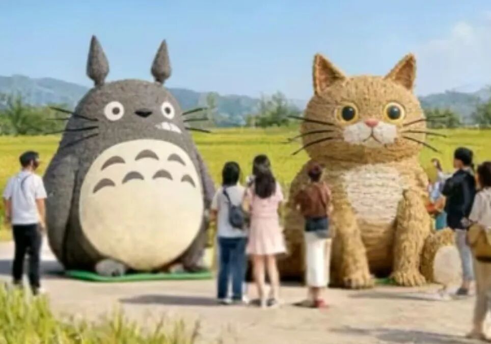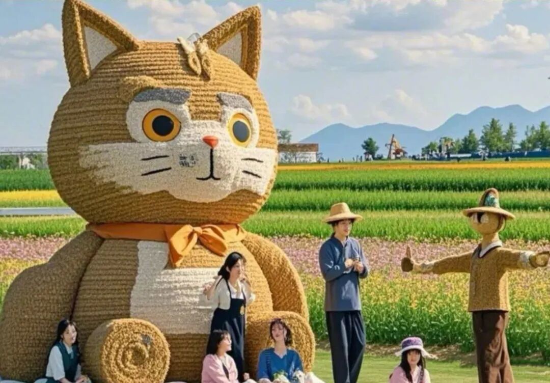 稻田里的大地艺术展别具一格,以稻草为原生原料,精心打造出巨型农耕人物、萌趣动物造型以及朝鲜族民俗主题等大型草雕作品。田间还搭配了草垛座椅、创意打卡相框等装置,一步一景皆成画,让游客在田园间随手就能拍出氛围感十足的大片。