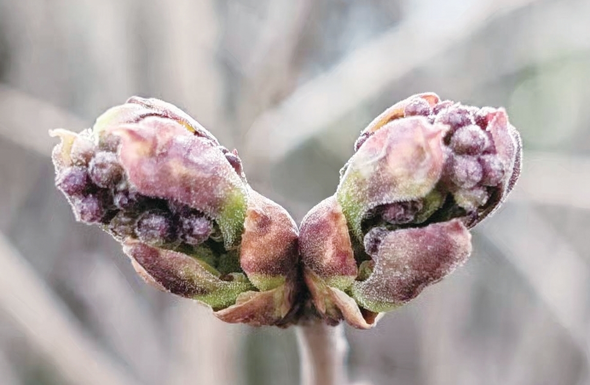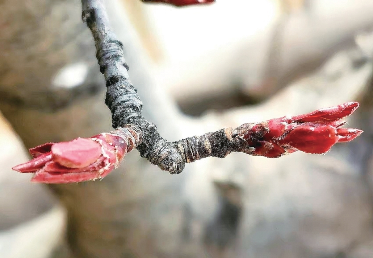 斜阳穿过枝桠,吻上嫩得欲滴的芽苞,卷曲的叶瓣裹着橘红光晕,像春风唤醒的小手掌,漾着透亮的生机。新叶从芽间探首,边缘晕着淡红,与花苞的热烈相映,红得明艳、绿得鲜活,连空气里都漾着清甜的生机。