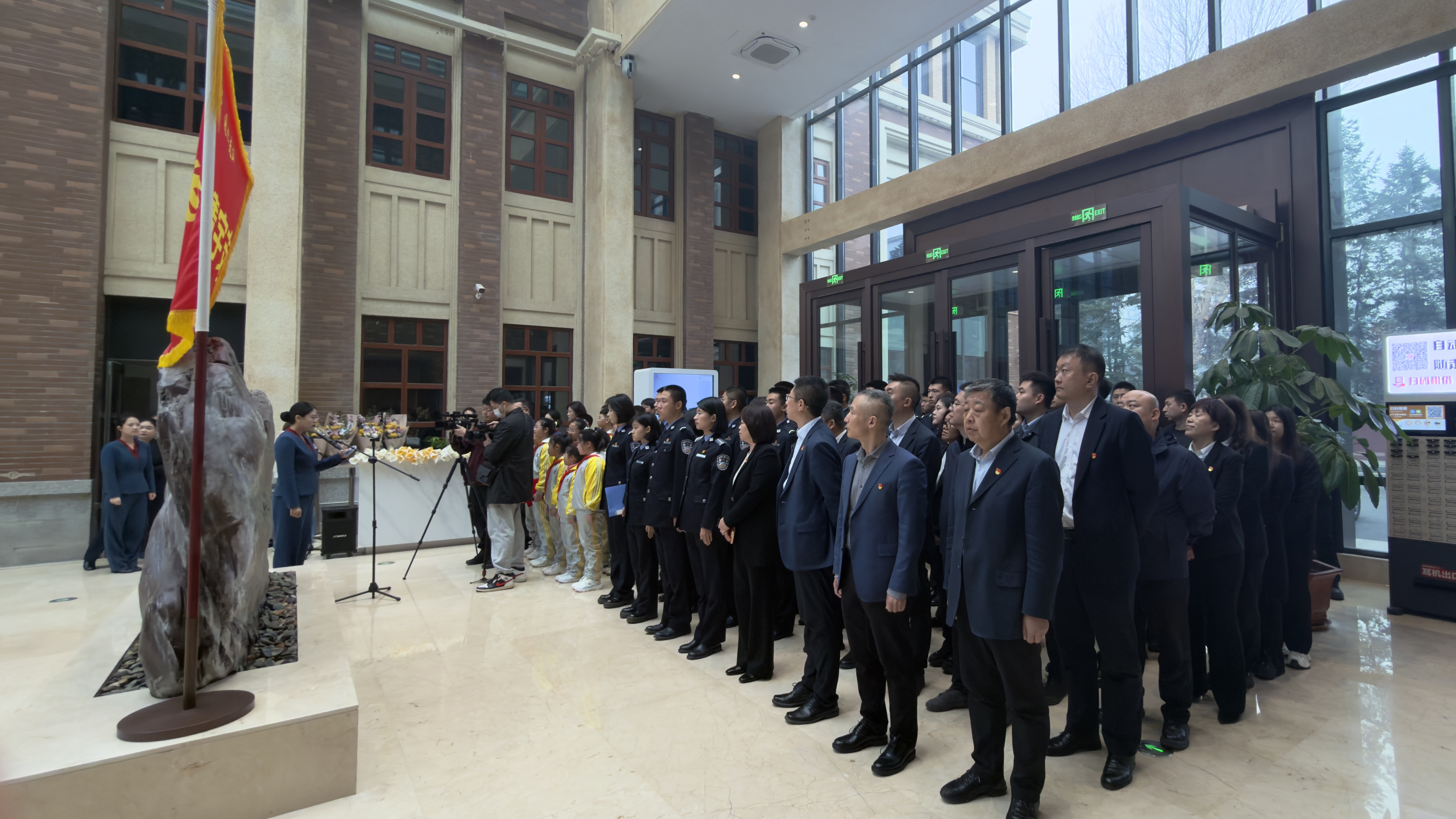活动现场庄严肃穆,全体人员整齐列队、脱帽肃立,奏响《义勇军进行曲》,激昂旋律回荡展厅;国歌奏毕,众人面向杨靖宇支队战旗低头默哀,以无声敬意寄托对英烈的深切哀思。