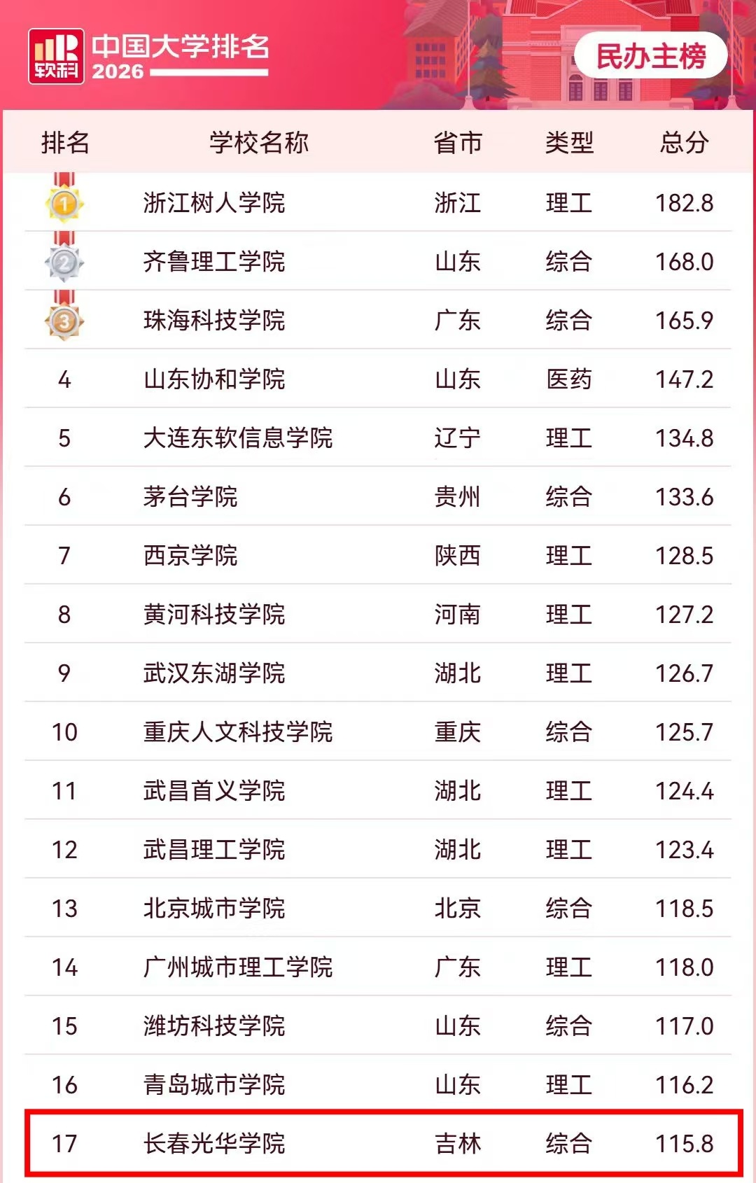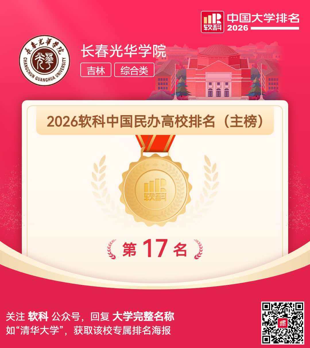 4月15日,高等教育专业评价机构软科正式发布“2026软科中国大学排名”。在这份备受瞩目的榜单中,长春光华学院表现卓越,位列全国民办高校(主榜)第17名,在综合类民办高校中高居第7名,连续三年蝉联吉林省民办高校第一!这一佳绩再次彰显了学校强劲的综合实力与高质量发展的坚实步伐。