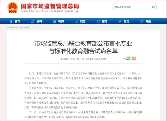2026年4月21日,国家市场监督管理总局、教育部联合印发《关于公布专业与标准化教育融合试点名单的通知》,全国共有253所高校的281个试点项目入选。机械工程学院“国一流”专业机械工程凭借扎实专业建设基础、鲜明产教融合特色与清晰改革实施方案,成功获批首批试点,成为吉林省9所入选高校中唯一一所民办本科高校,这标志着长春光华学院专业建设、课程改革与标准化育人工作迈上国家级新台阶。